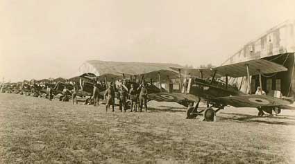 No 32 Squadron RAF 1918 cont'd The Squadron settled down to a pattern of escorting bombing formations pilots typically flying one or two patrols a day depending on the weather. Lt. Rogers an american RFC volunteer described the start of a typical patrol with his example a patrol to leave the ground at 4 o'clock: "About three thirty all the machines are wheeled out and lined up in front of the hangars. .. At a quarter to four the engines are started, twenty, 200 hundred horse power motors just ticking over; twenty shiny propellors glistening in the sun; ... forty exhausts rumbling and belching blue smoke. Then the pilots straggle up and prepare for the journey up above. Preparing consists of putting on light, but very warm fur lined suits ... lined sheepskin boots, fur lined helmets, and polishing up the goggles. They have a little confab, the commander telling them what's to be done, looking over their maps and straightening things out generally. Then they climb into the machines, get nicely strapped in, maps arranged, gloves on, and everything fixed just so. Always before leaving the ground the pilot runs up his motor. Blocks are in front of the wheels, a mechanic at each wing, and one hanging on the tail. The motor is run up slowly at first, then to top speed the machine trembling and straining at the blocks. Everything ready the pilot waves his hand, the blocks are pulled and the flights taxi out to take off one at a time. A couple of turns round the aerodrome to get a close formation and they're away to the line..." (1)